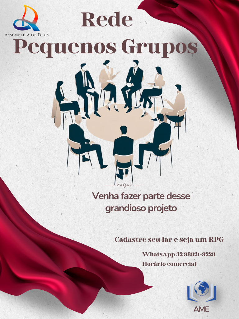A AME está lançando em parceria com a IEADAP de Além Paraíba – MG o Projeto RPG – Rede Pequenos Grupos. Este trabalho é a “antiga célula”, e tem como objetivo pregar o evangelho de maneira mais pessoal, singular e simples, com reuniões em lares hospedeiros para assim alcançar os vizinhos e amigos para o SENHOR JESUS. Caso você deseje que o teu lar se torne um RPG entre em contato com a AME 32 98821-9228 – horário comercial, de segunda-feira à sexta-feira.