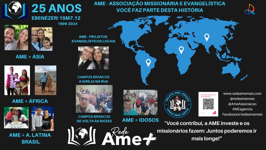 Toda a Diretoria da AME está se preparando para este evento desde 2023, pois, 25 anos são passados desde o início desta obra. Missões é um desafio diário e constante, pois, nem a liderança cristã que está à frente da Igreja, nem os líderes de departamentos e ministérios e, nem os membros em geral tem uma visão cristalina da obra missionária. É triste ver as lideranças gastando fortunas em seus prédios luxuosos para acomodar os “fiéis”, que se reúnem na maioria das vezes, para encontros que massageiam seu ego, e só se preocupam em ir, no máximo uma vez por semana ao templo, que fica a maior parte do tempo fechada, com raras exceções.