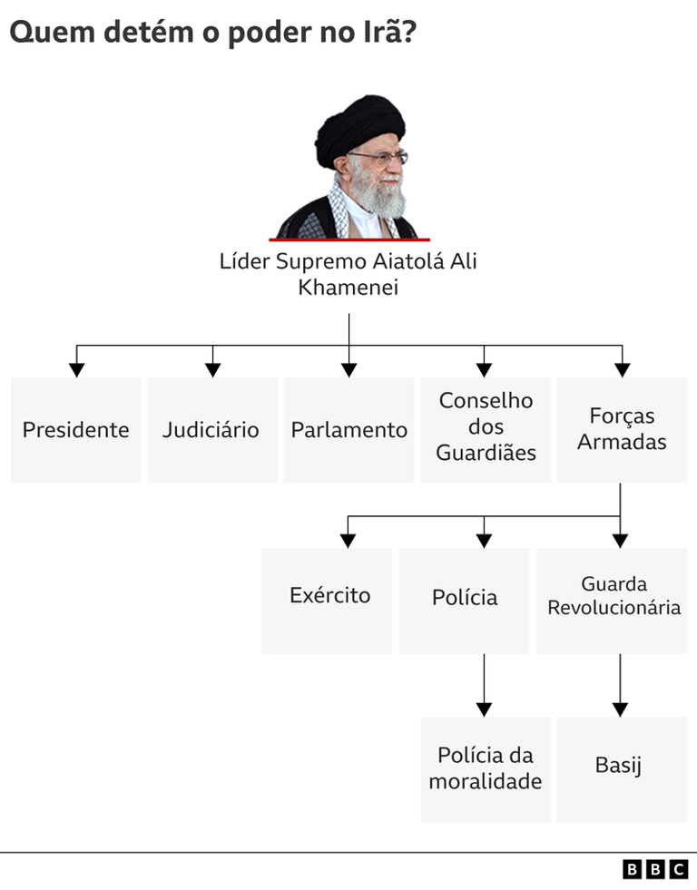 O Irã tem um líder supremo que comanda todos os outros poderes, e todos lhes prestam obediência, este é o Aiatolá Ali Kamenei, que foi um agente importante da grande revolução islâmica no Irã em 1979. Abaixo da linha de autoridade vem Presidente, judiciário, Parlamento, Conselho dos Guardiães, Forças Armadas, todas essas estão em uma mesma linha de autoridade. e ligadas diretamente ao Líder Supremo Aiatolá. As Forças Armadas por sua vez, tem como submissas a si O Exército, a Polícia e a Guarda Revolucionária; a Polícia tem sob sua autoridade a Polícia da Moralidade e a Guarda Revolucionária tem sob seu comando os Basij.